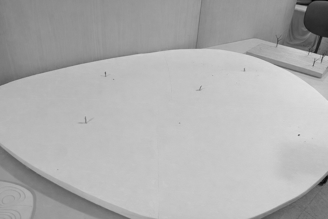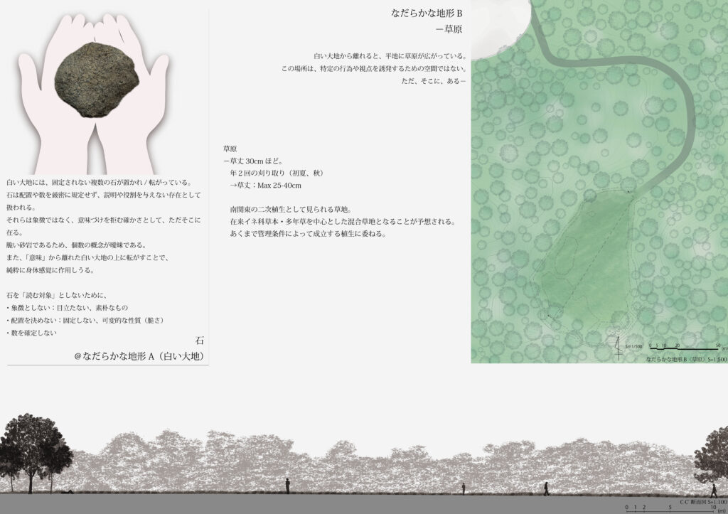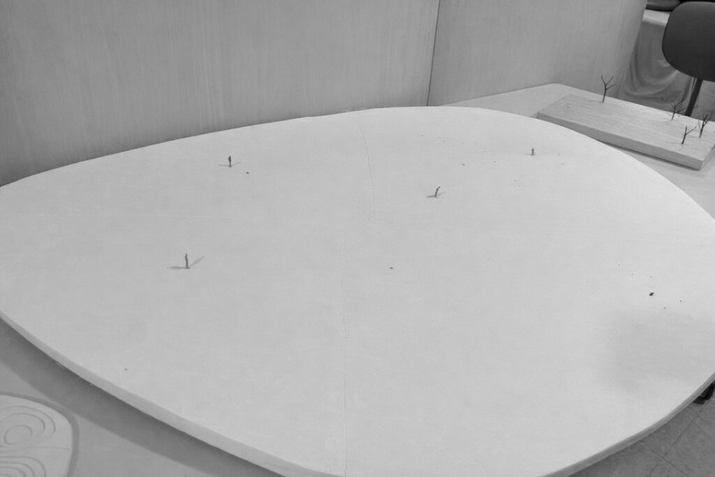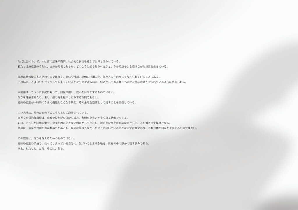 意味や肩書きに囲まれた日常から静かに距離を取り、知覚の状態そのものを変化させることを目指したランドスケープである。敷地へと続く長い坂道を上り切ると、高反射の白い地面がわずかな起伏だけを伴って広がる。輪郭や奥行きの手掛かりは乏しく、歩みを進めるにつれて視線や距離感は曖昧になり、これまで無意識に拠り所としていた判断や参照の基準が徐々に揺らいでいく。やがて地表に点在する石に触れ、足裏に伝わる硬さや重さを受け取ることで、身体は思考よりも先に足元の確かさへと立ち返る。その先に広がる草地では、ただ時間だけが経過している。そこで人は、意味づける以前の自らの在り方に、ふと気づく可能性を与えられる。