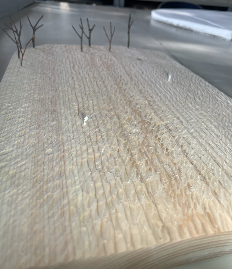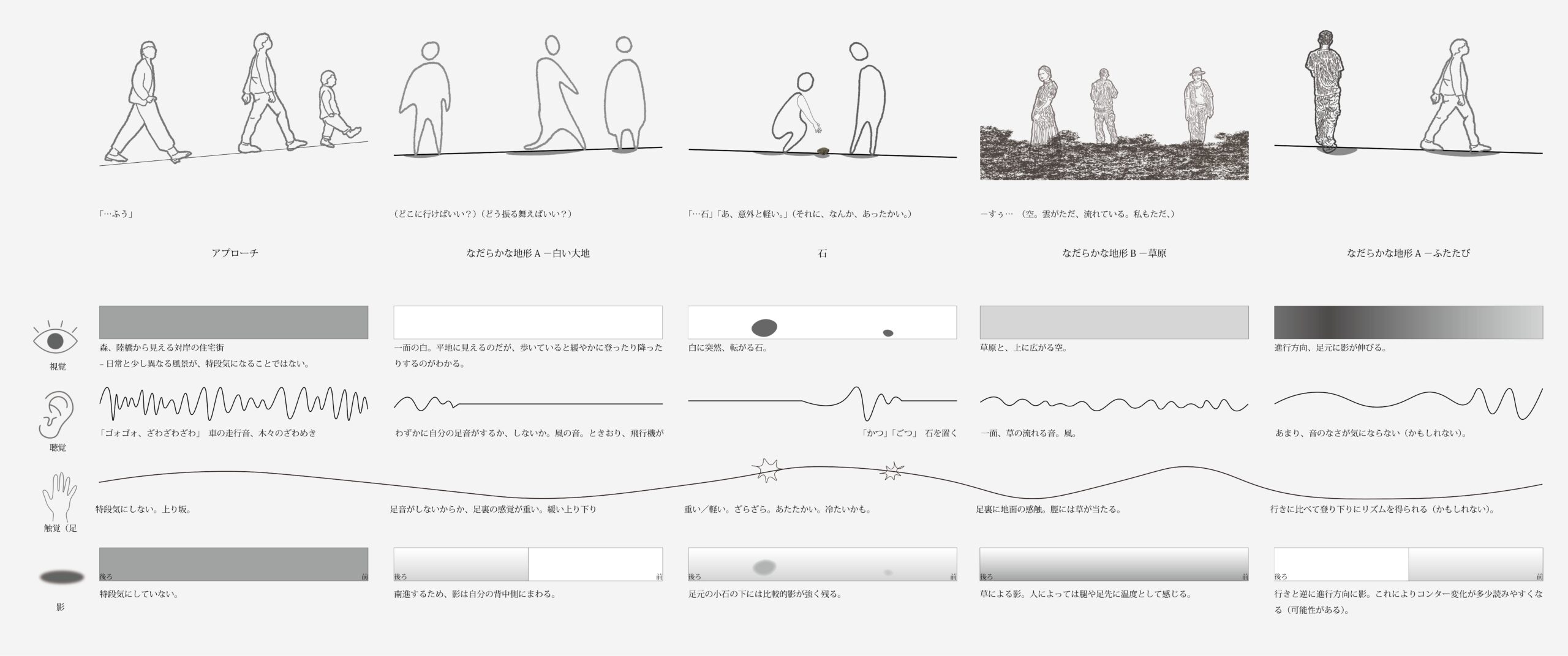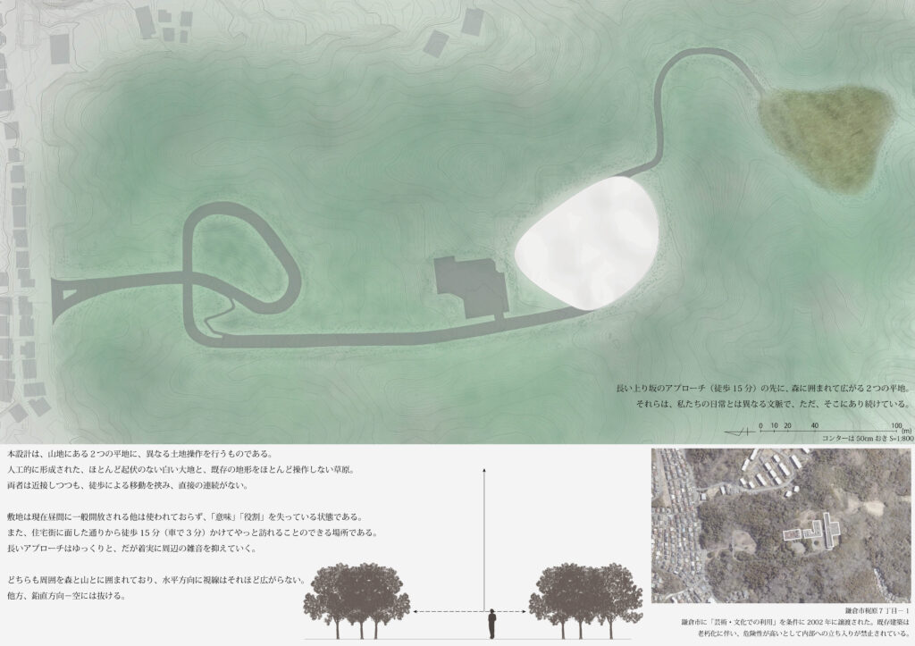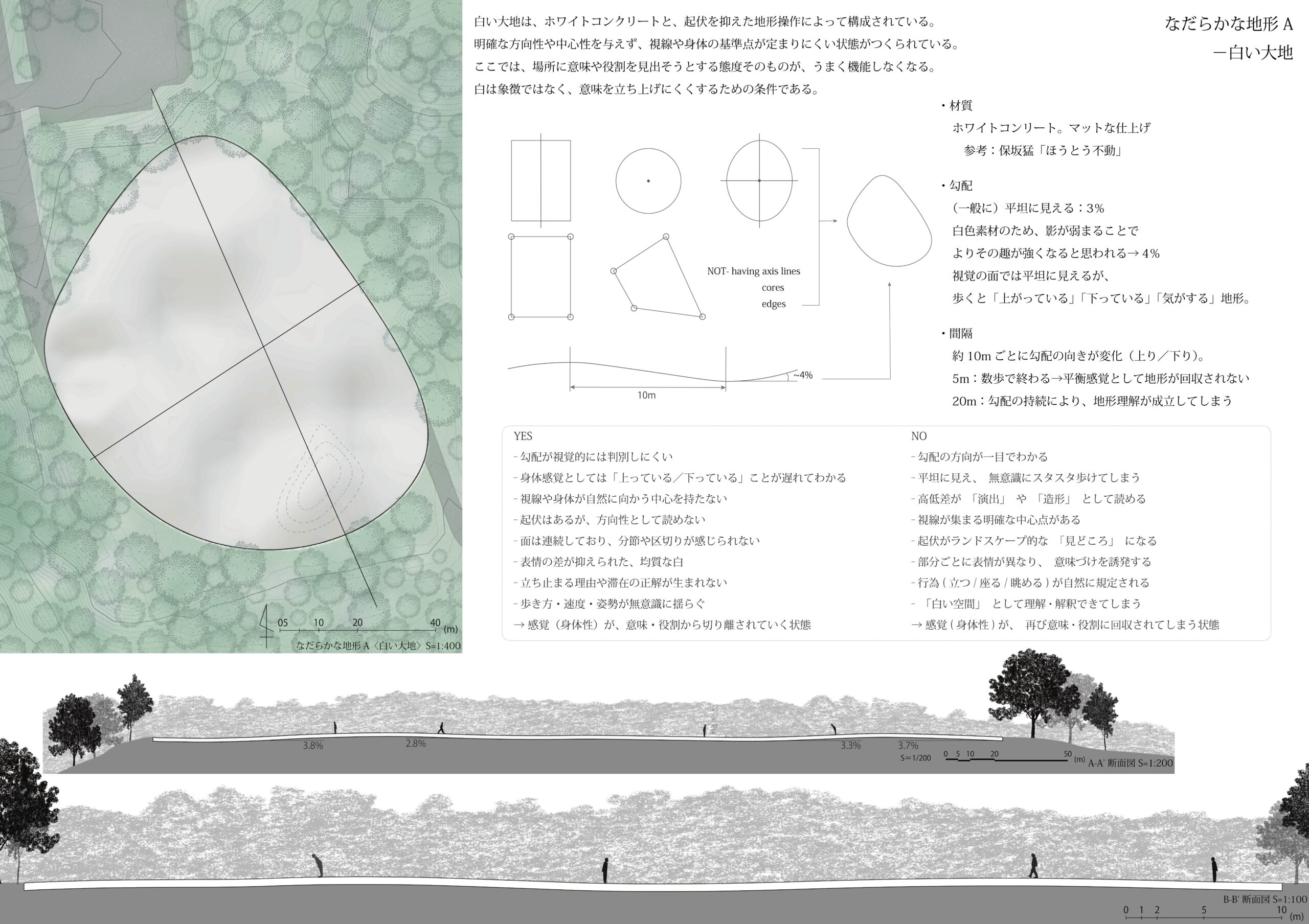 意味や肩書きに囲まれた日常から静かに距離を取り、知覚の状態そのものを変化させることを目指したランドスケープである。敷地へと続く長い坂道を上り切ると、高反射の白い地面がわずかな起伏だけを伴って広がる。輪郭や奥行きの手掛かりは乏しく、歩みを進めるにつれて視線や距離感は曖昧になり、これまで無意識に拠り所としていた判断や参照の基準が徐々に揺らいでいく。やがて地表に点在する石に触れ、足裏に伝わる硬さや重さを受け取ることで、身体は思考よりも先に足元の確かさへと立ち返る。その先に広がる草地では、ただ時間だけが経過している。そこで人は、意味づける以前の自らの在り方に、ふと気づく可能性を与えられる。