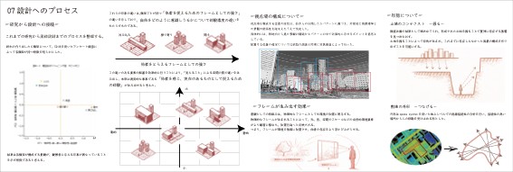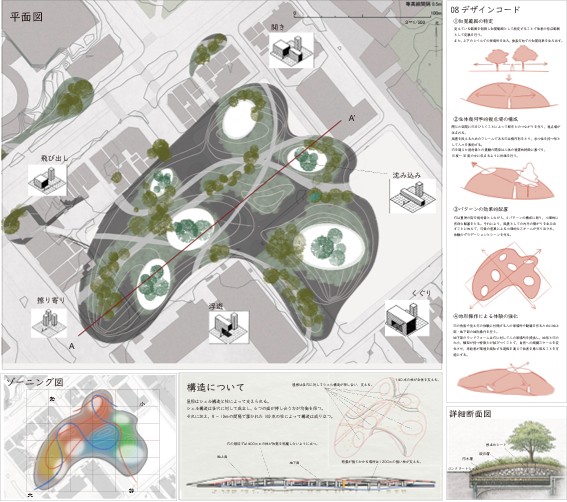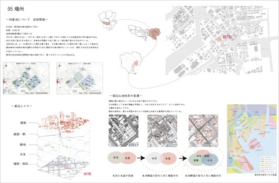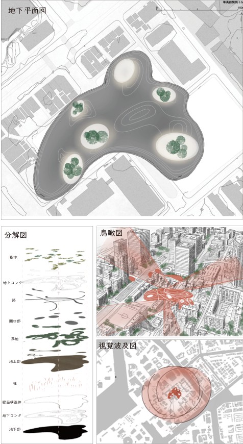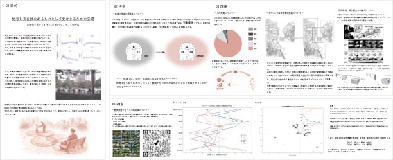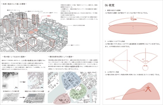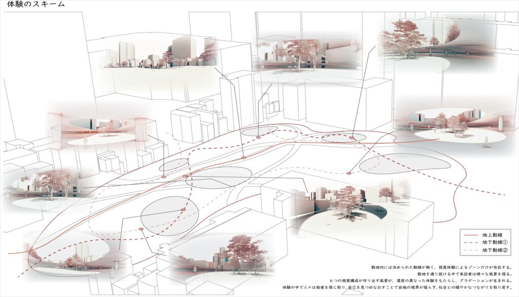 「揺れる境界」は、ギブソンの提唱した生態学的視覚論を手がかりに、都市における他者との関係性をランドスケープから再考する試みである。人は環境の中で、形そのものではなく「関係」を知覚しているという視点に基づき、都市景観に現れる視覚構造を六つの類型として整理。SD法による心理評価を通して、それぞれがもたらす印象の違いを分析した。さらにその知見を地形やレベル差、覆いの操作へと展開し、視線が交錯する風景を構成する。境界が揺らぐ知覚体験を通して、他者が背景ではなく風景の一部として立ち上がる空間を提案する。