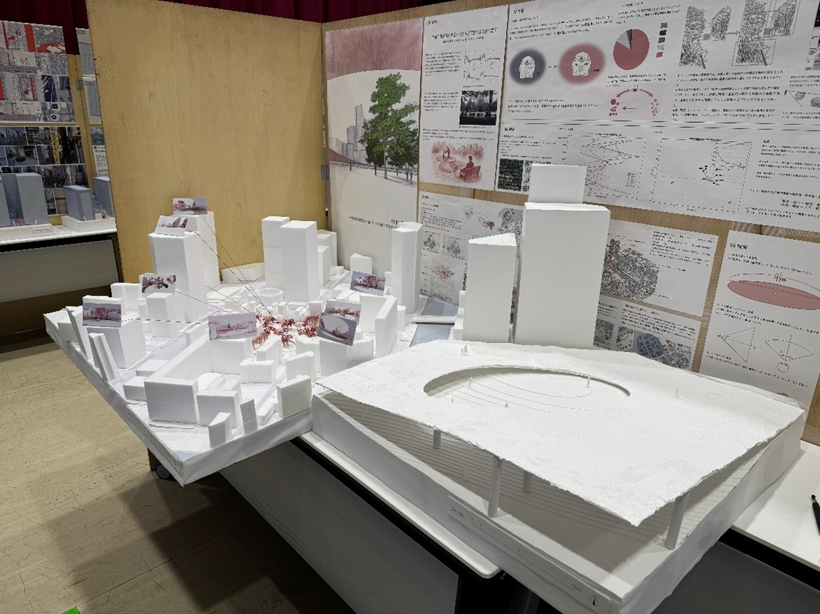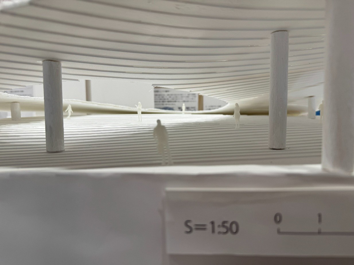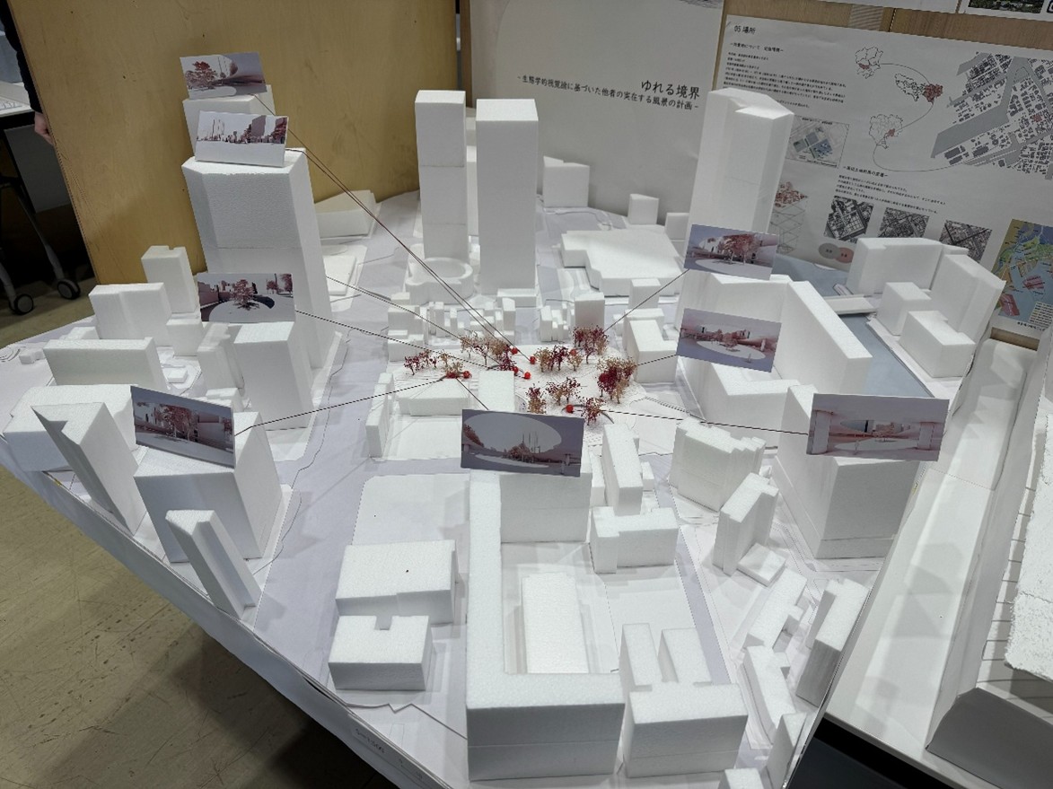 「揺れる境界」は、ギブソンの提唱した生態学的視覚論を手がかりに、都市における他者との関係性をランドスケープから再考する試みである。人は環境の中で、形そのものではなく「関係」を知覚しているという視点に基づき、都市景観に現れる視覚構造を六つの類型として整理。SD法による心理評価を通して、それぞれがもたらす印象の違いを分析した。さらにその知見を地形やレベル差、覆いの操作へと展開し、視線が交錯する風景を構成する。境界が揺らぐ知覚体験を通して、他者が背景ではなく風景の一部として立ち上がる空間を提案する。