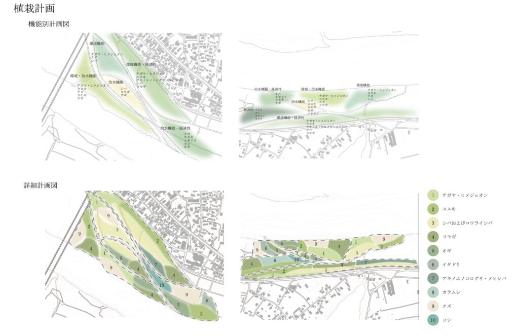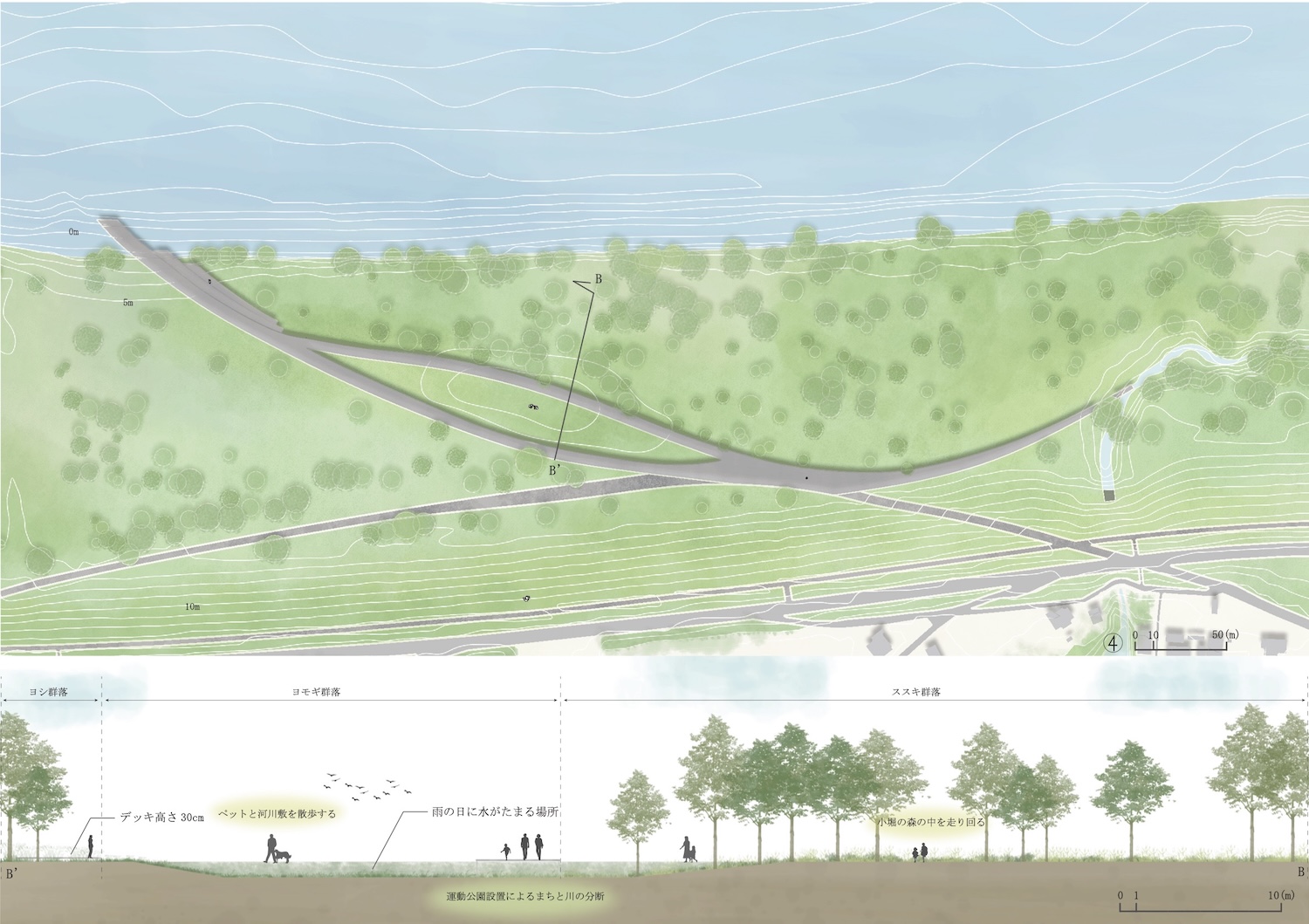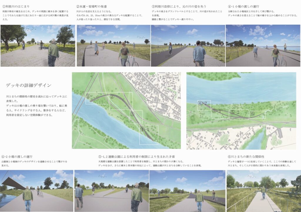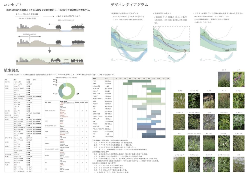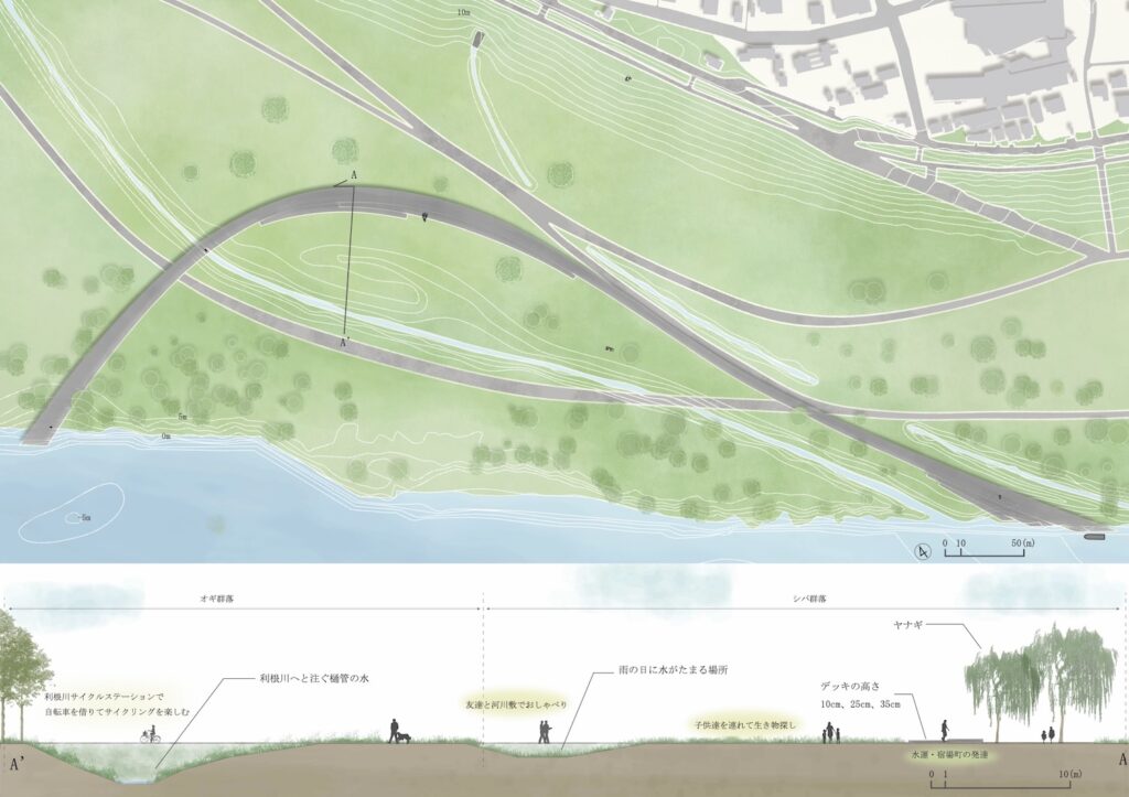 This design therefore draws on memories engraved in the topography, such as the course of the old Tone River, its connection with the divided Kobori district, and the vegetation of the Tone River, to reconstruct the relationship between the river and town from the diverse spatial experiences that unfold on this basis, aiming to create a new riverbank space that serves as a bridge between the town and the river.