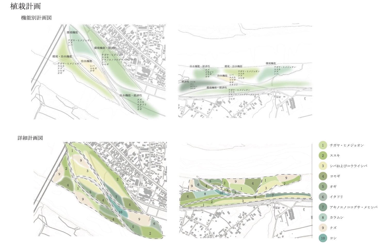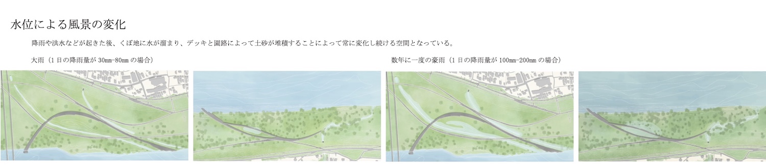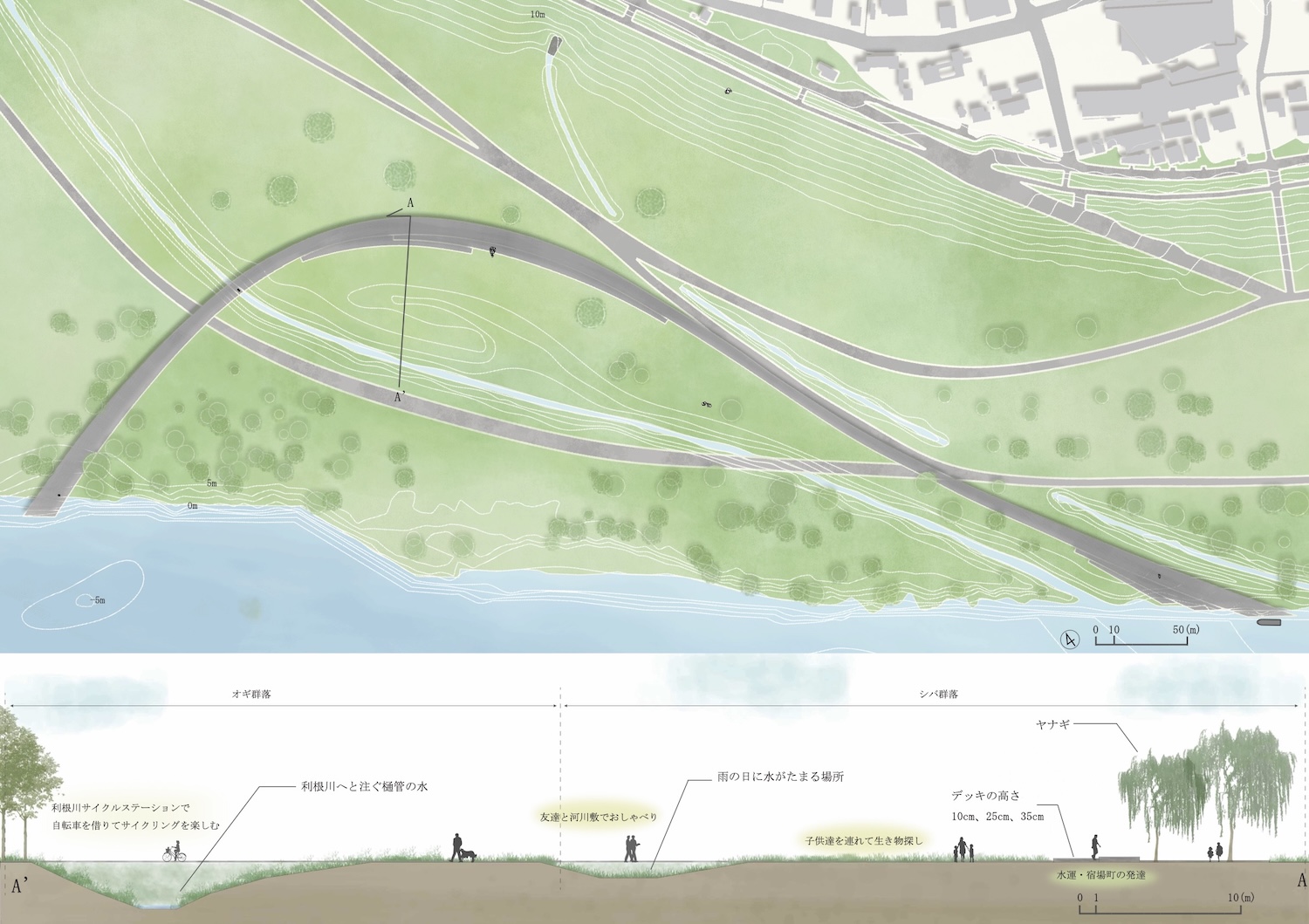 そこで本設計では、旧利根川の流路や分断された小堀地区とのつながり、利根川の植生など、地形に刻まれた記憶を手がかりに、その上で展開される多様な空間体験から川と町の関係を再構築し、まちと川の架け橋となる新たな河川敷空間を構築することを目指す。