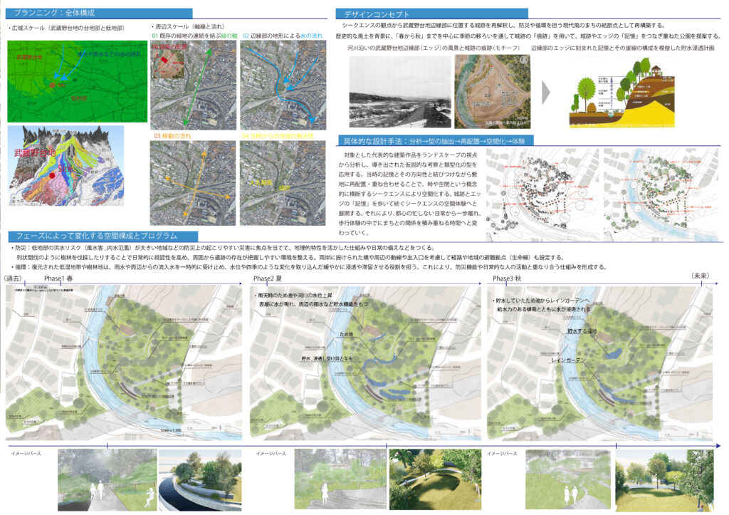 本提案は東京都三鷹市の遺跡と周辺の河川緑地空間を対象に、地理的特性を活かし、移動体験を通して過去の記憶を繋ぎ、季節の移ろいにより変化していくランドスケープを提案する。シークエンスの観点から城跡を再解釈し、谷口吉生の作品の分析から抽出した空間の類型を応用する。背後の文脈を読み解きながら再配置し、防災のための経路や拠点、水循環を促す変化する仕組みにより防災と循環を担う公園として再構築することを目指す。