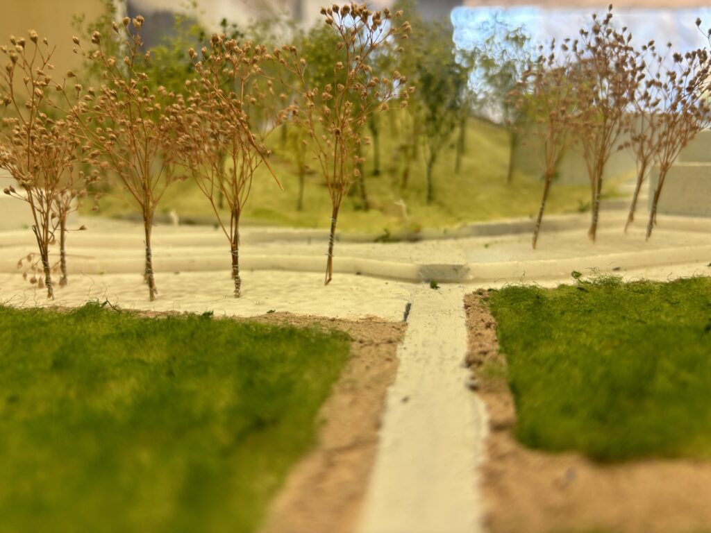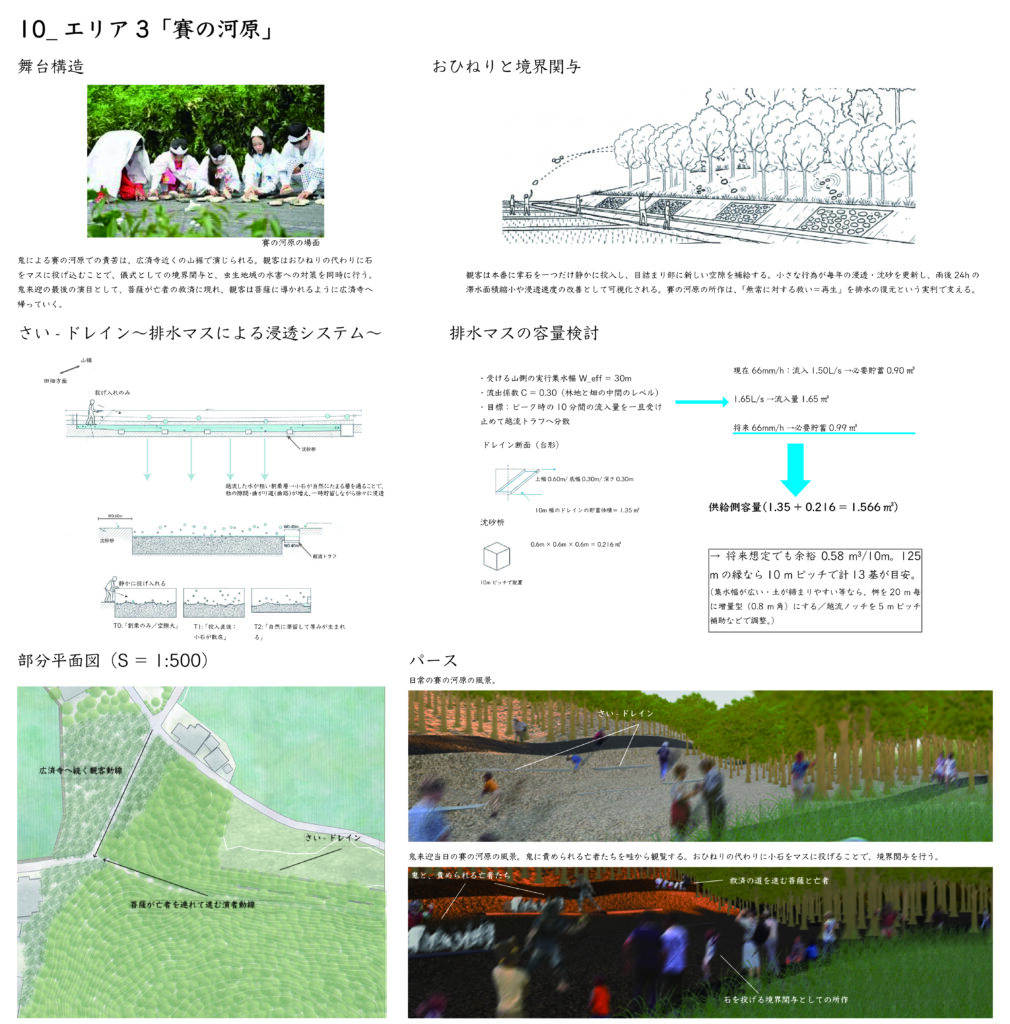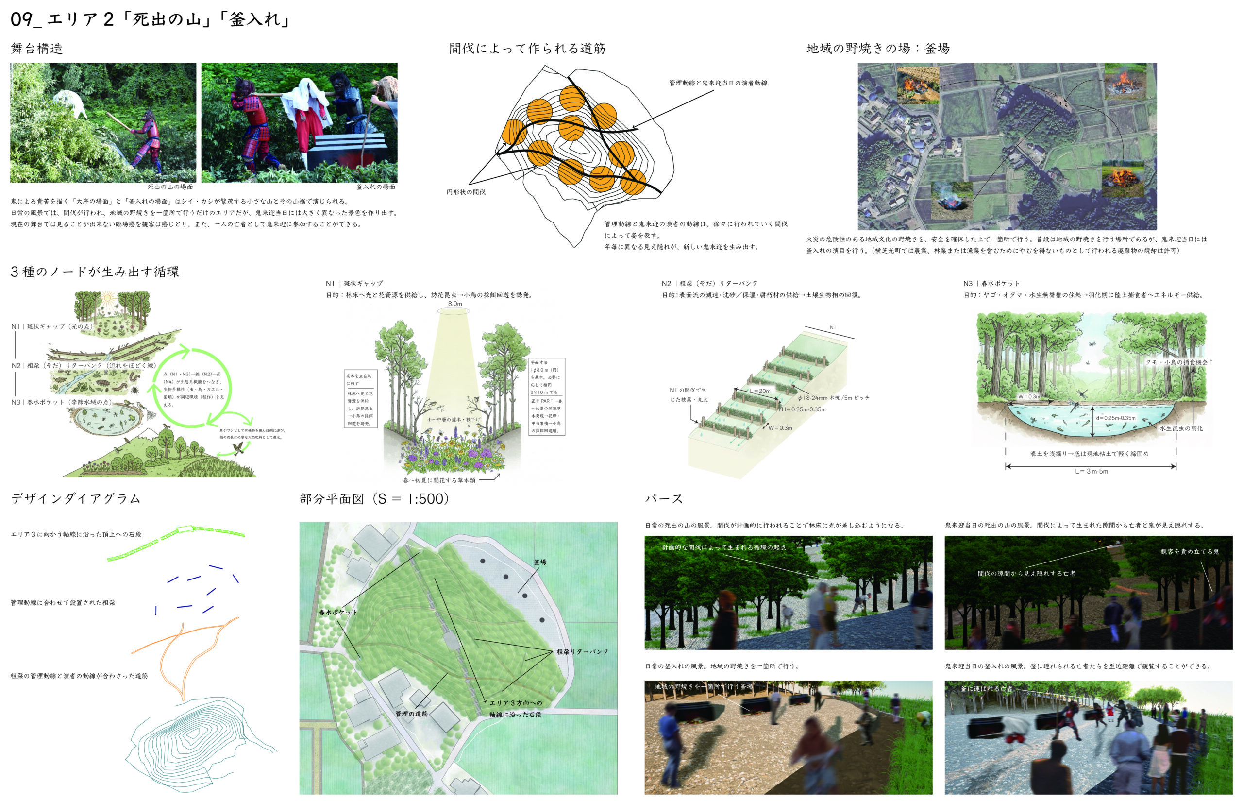 This proposal focuses on the folk performing art Kiraigō (a nationally designated Important Intangible Folk Cultural Property) passed down in Mushyou, Yokoshibahikari Town, Chiba Prefecture. It proposes a “dual space” where the performance day (special occasion) and daily foundational management (everyday life) switch within the same spatial resources. A meandering stage layout balances spectatorship with boundaries (order and safety). In everyday use, it functions as a space for maintenance, learning, preparation, and documentation, while providing a phased entry point for engagement that connects to the practitioners. Through the renewal of rice paddy ridges, thinning of satoyama forests, and installation of drainage systems, it creates a circuit where agricultural regeneration and cultural inheritance mutually support each other.