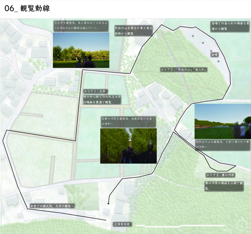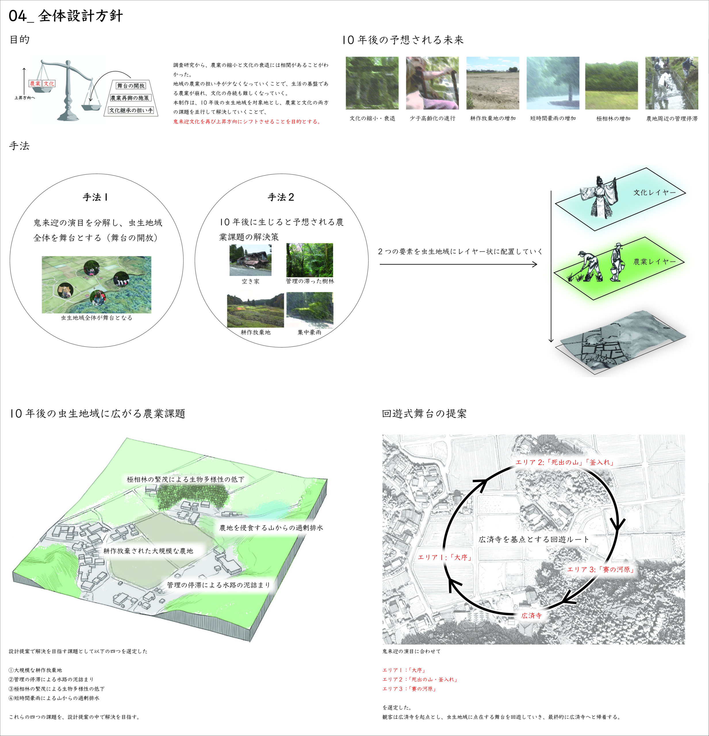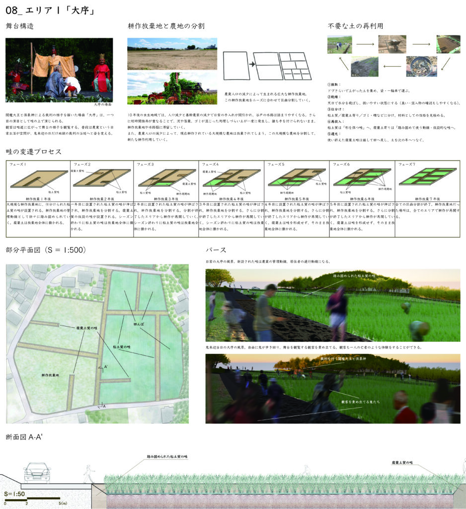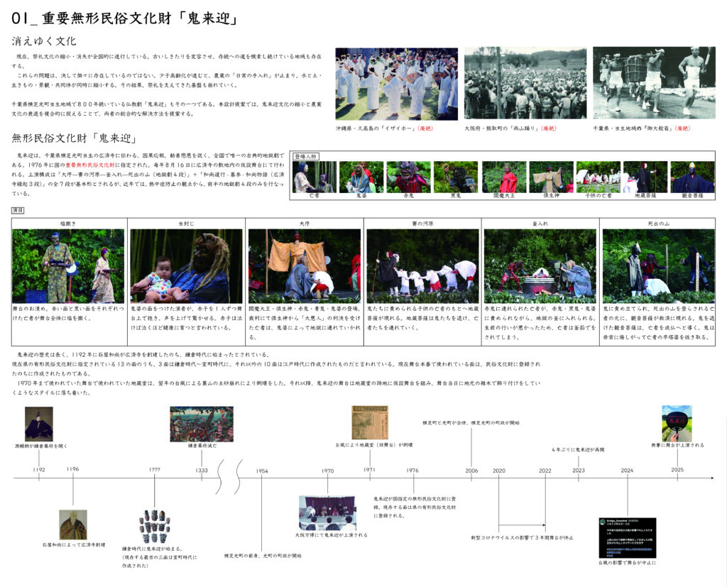 千葉県横芝光町虫生に伝わる民俗芸能・鬼来迎(国指定重要無形民俗文化財)を対象に、当日の上演(ハレ)と日常の基盤管理(ケ)が同じ空間資源の上で切り替わる「二重の場所」を提案する。回遊式の舞台動線で観覧と境界(秩序・安全)を両立し、平時は手入れ・学習・準備・記録の受け皿として機能させ、関与の入口を段階化して担い手へ接続する。畦の更新、里山の間伐、排水の設えを通じて、農の再生と文化の継承が支え合う回路を描く。
