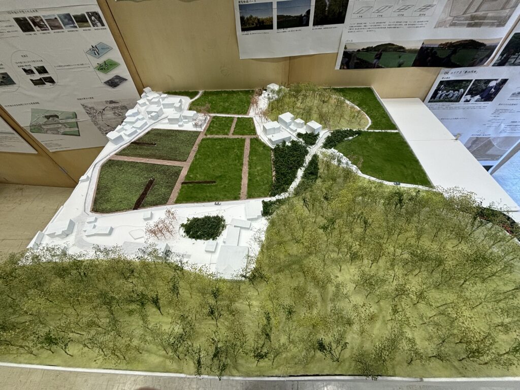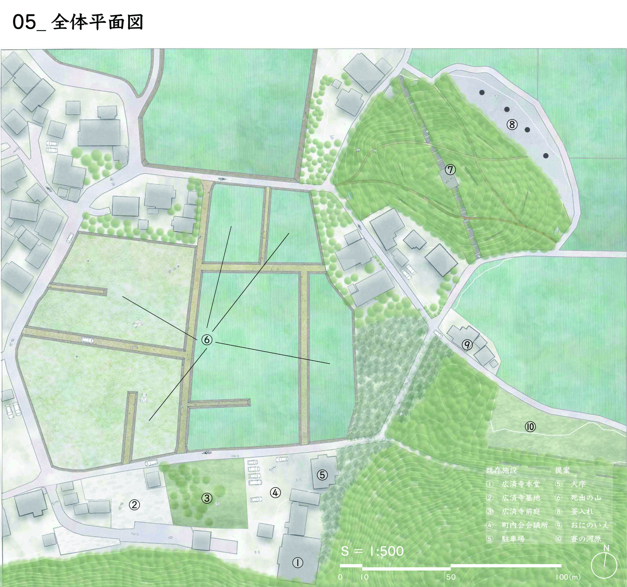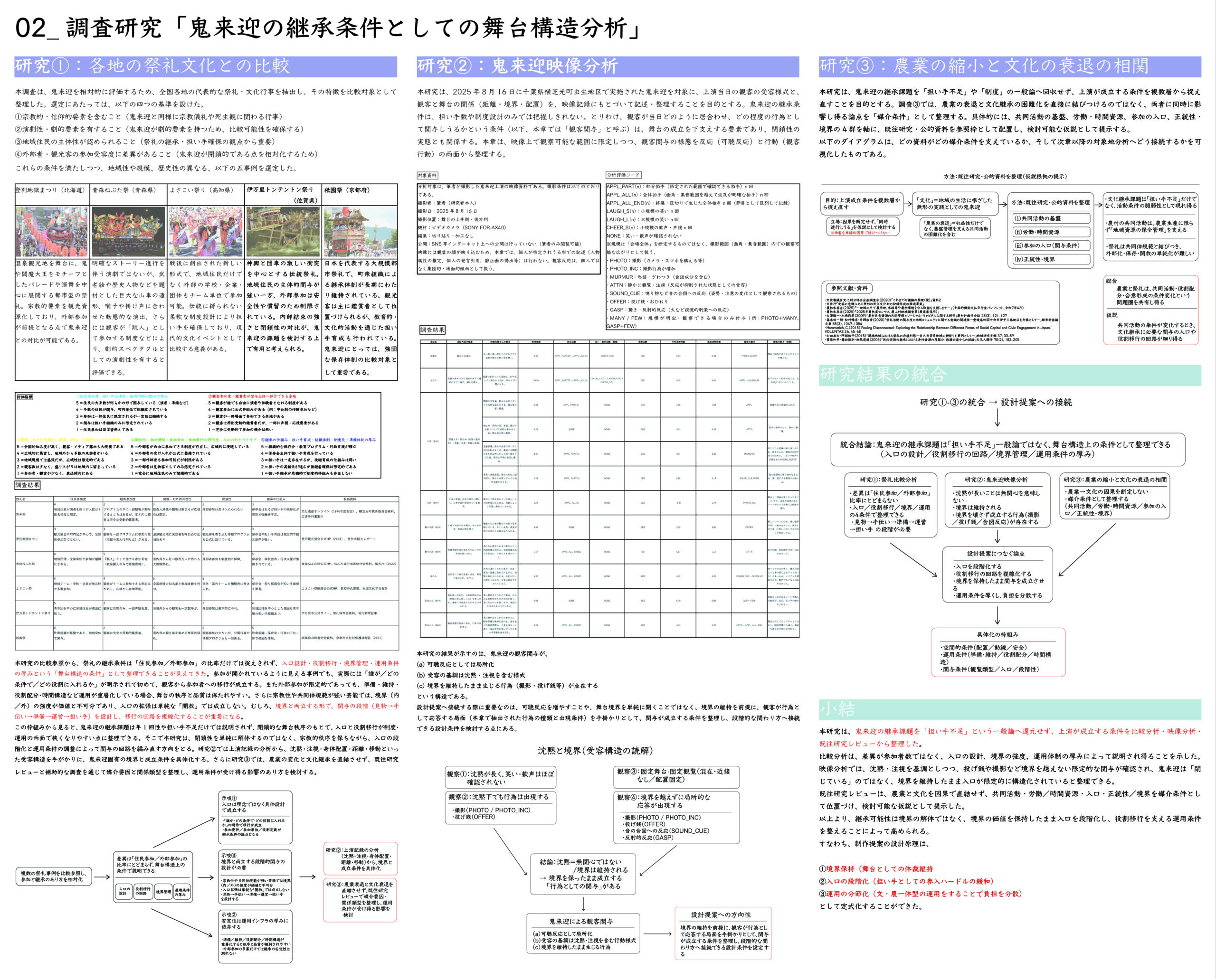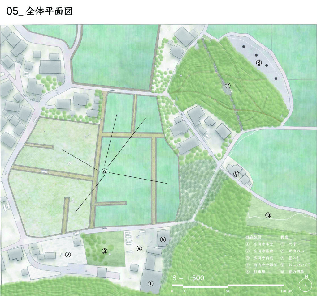 千葉県横芝光町虫生に伝わる民俗芸能・鬼来迎(国指定重要無形民俗文化財)を対象に、当日の上演(ハレ)と日常の基盤管理(ケ)が同じ空間資源の上で切り替わる「二重の場所」を提案する。回遊式の舞台動線で観覧と境界(秩序・安全)を両立し、平時は手入れ・学習・準備・記録の受け皿として機能させ、関与の入口を段階化して担い手へ接続する。畦の更新、里山の間伐、排水の設えを通じて、農の再生と文化の継承が支え合う回路を描く。